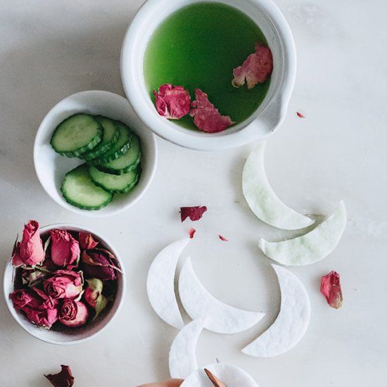 Steep two tea bags for 3 minutes in hot water, remove and set aside to cool to room temperature and then place over your eyes for 15 minutes. You can layer a cool washcloth over your eyes to keep the tea bags wet. Remove and follow with your moisturizer and eye oil.