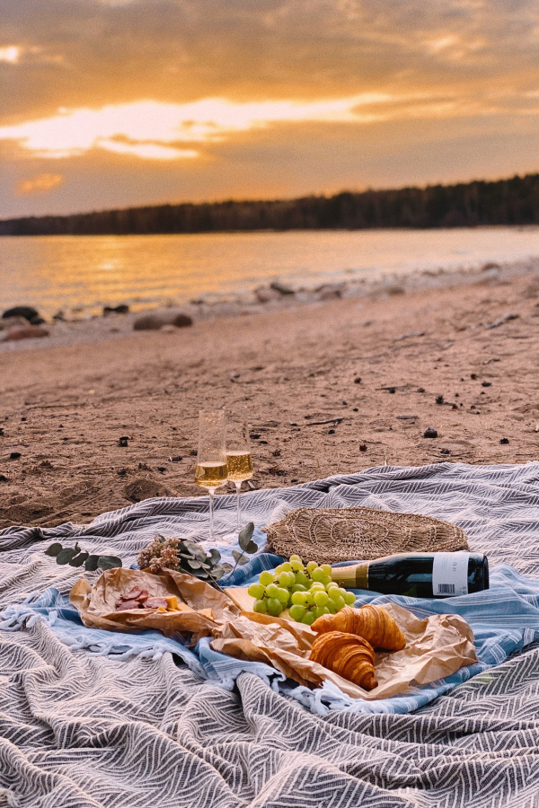 When it comes to location, you want a place where you can enjoy the sunshine and retreat to some shade if you get too warm. A public park, the beach, or even your backyard are all great options. The next step is to pick a time, and IMO, there is no bad time of day to have a picnic. Make it a brunch, an afternoon hangout, or even a nighttime soirée that ends with s’mores and watching the sunset.